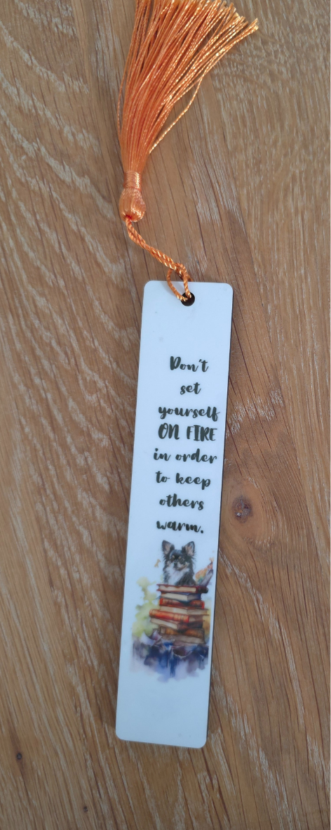 Bladwijzer met inspirerende quote-"Don't set yourself on fire in order to keep others warm."-Hondje en boeken- Perfect cadeau voor boekenliefhebbers-