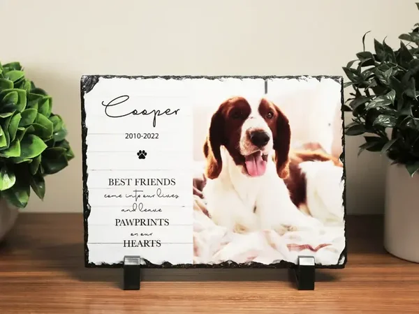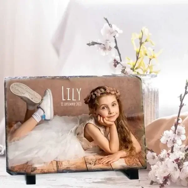 Deze personaliseerbare leisteen van 30x30cm is een stijlvolle en duurzame manier om herinneringen vast te leggen. De leisteen kan bedrukte worden met een foto, naam, datum of persoonlijke tekst, waardoor ze perfect geschikt is voor communie, geboorte, huwelijk, jubileum en andere bijzondere momenten.